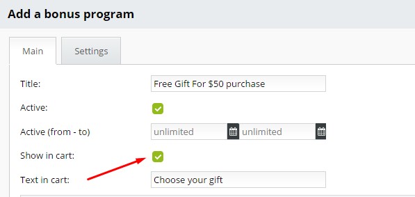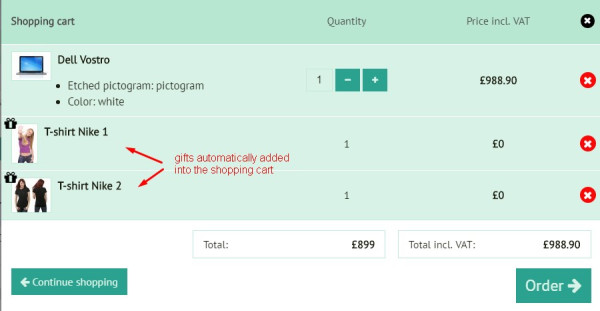If your customer has right for one or more bonuses without additional payment, you can activate feature "Put bonus into cart automatically". The gifts are added to the shopping cart of your customer, without a choice of selection.